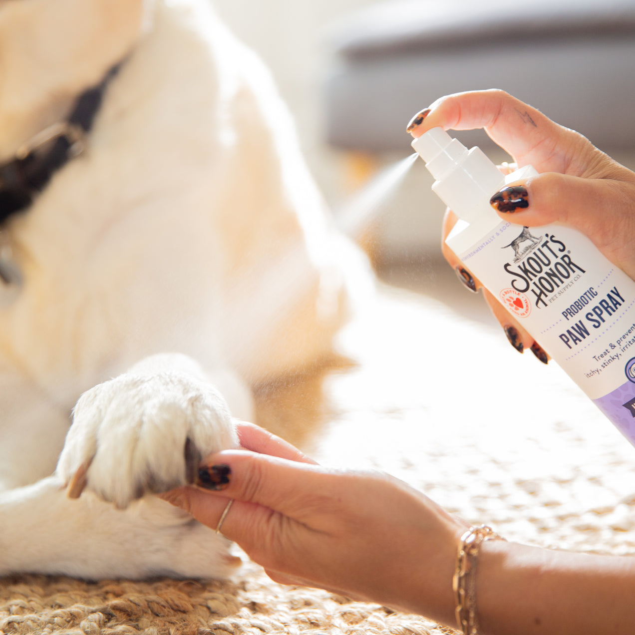 Skout’s Honor Probiotic Paw Spray is a Microbiome-Friendly Certified solution for itchy, stinky, irritated paws. Powered by a live, topical probiotic kefir and soothing aloe, this non-medicated, daily-use formula helps relieve discomfort while supporting your pet's natural defenses. Spray on paws, pads and in between the toes. As part of the Skout’s Honor Wellness collection, our Probiotic Paw Spray offers a modern, holistic approach that is backed by science and powered by nature to target the root cause of skin and paw irritation.