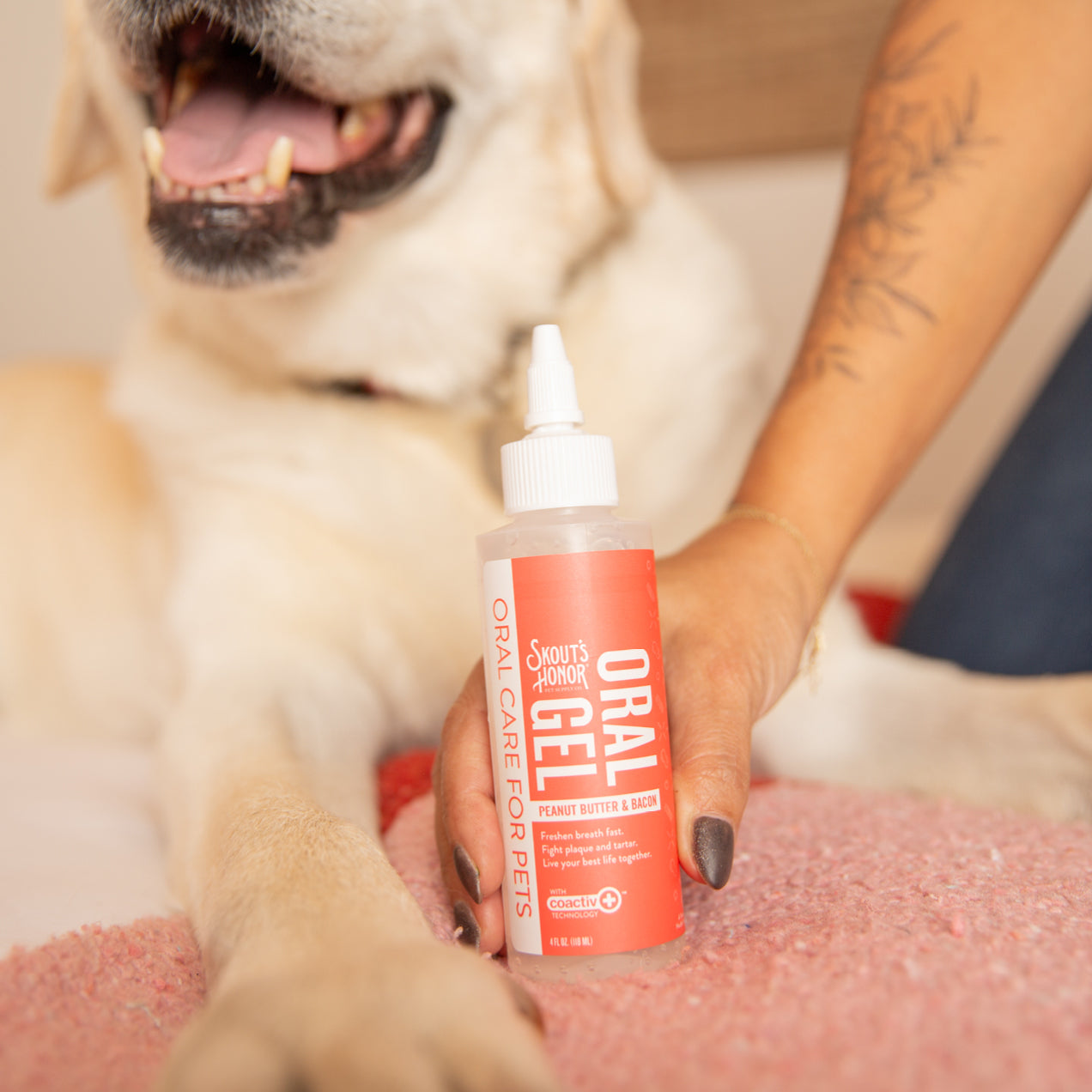 Skout’s Honor Peanut Butter & Bacon Oral Gel turns daily oral care into treat time—no brushing required. Powered by coactiv+® technology, this drool-worthy gel is a great alternative to toothpaste and targets the gums/teeth to help reduce and break down tartar, freshen breath fast, and promote good oral hygiene. Just apply directly to your pet’s gumline each day and make oral care feel like a reward, not a chore. As part of the Skout’s Honor Oral Care collection, it’s designed to help pet parents build an easy, daily oral care routine.