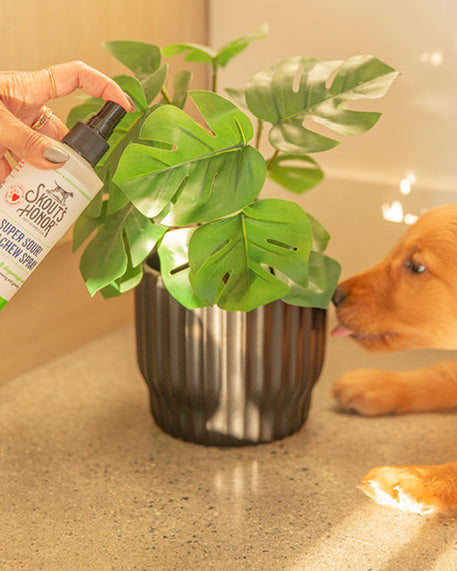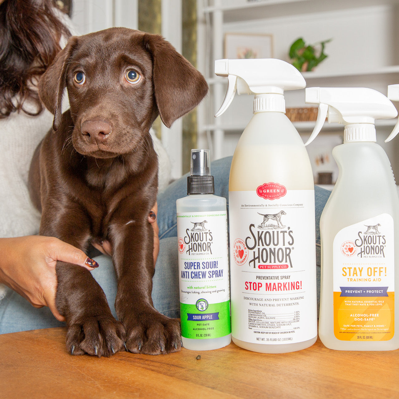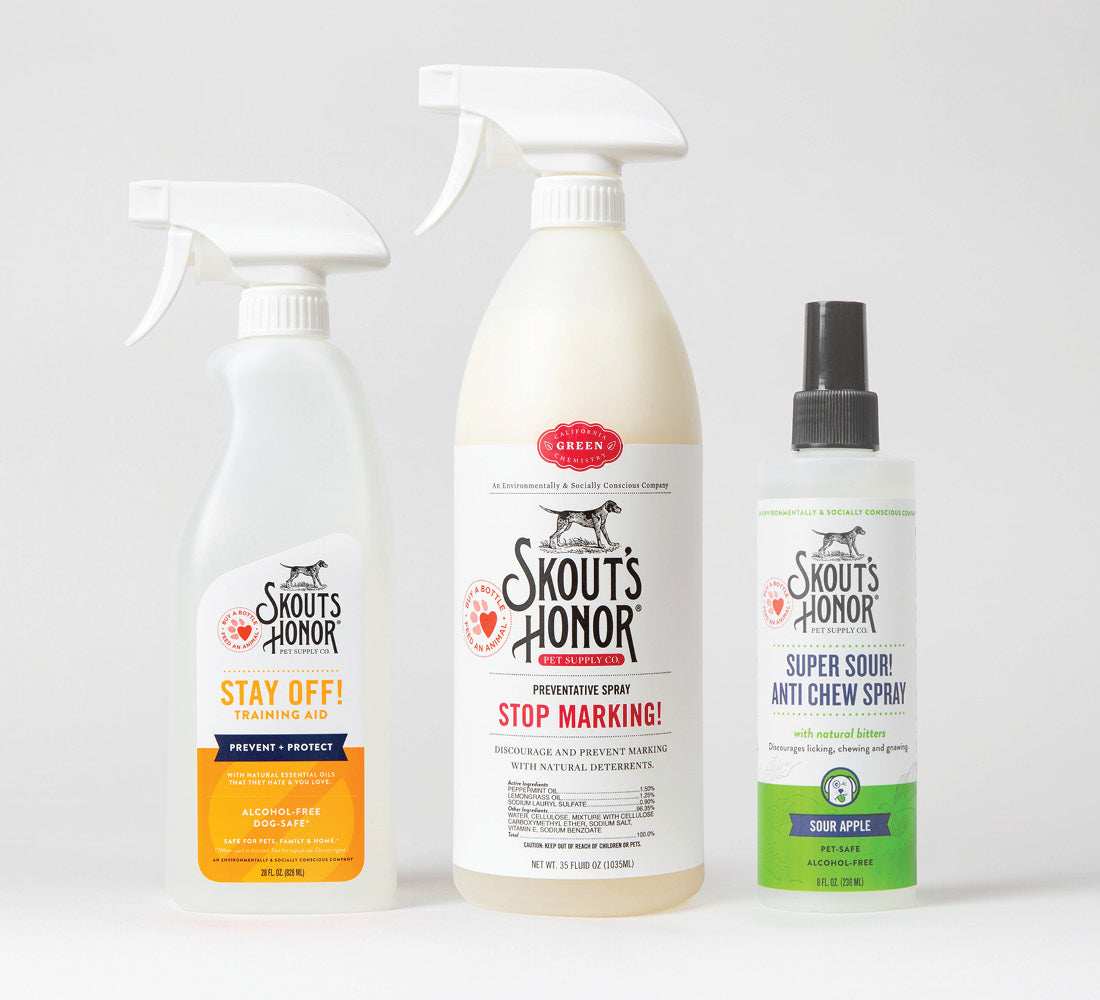 Skout’s Honor Training Aids are formulated to encourage positive behavior and set your pet up for success. Whether you’re dealing with chewing, marking, or scratching, our taste and natural scent-based deterrents offer an easy way to set clear boundaries and make training simpler for you and less stressful for your pet.