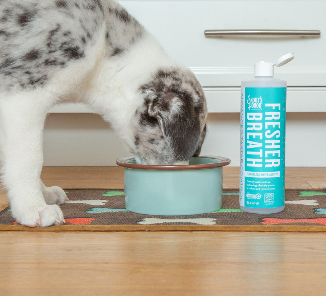Skout’s Honor Fresher Breath Water Additive is the simplest way to start your pet’s daily oral care routine—no brushing required. Powered by coactiv+® technology, this is the only VOHC-Accepted water additive for tartar control, and is clinically proven to reduce and break down tartar. Just add it to their water bowl daily to freshen breath and clean teeth. As part of the Skout’s Honor Oral Care collection, it’s designed to help pet parents build an easy, daily oral care routine.