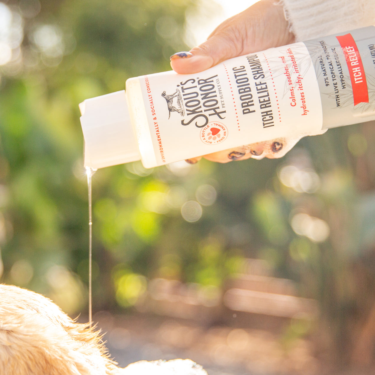 Skout’s Honor Probiotic Itch Relief Shampoo is a powerful, non-medicated solution for pets with itchy, irritated skin. Powered by a live, topical probiotic kefir, this gentle, fragrance-free shampoo hydrates irritated skin and provides long-lasting relief while supporting a healthy skin microbiome. It’s a go-to shampoo for pets with extra sensitive skin and helps bring comfort to your pet and peace of mind to you. As part of the Skout’s Honor Wellness collection, this shampoo offers a modern, holistic approach that is backed by science and powered by nature to target the root cause of itch and irritation.